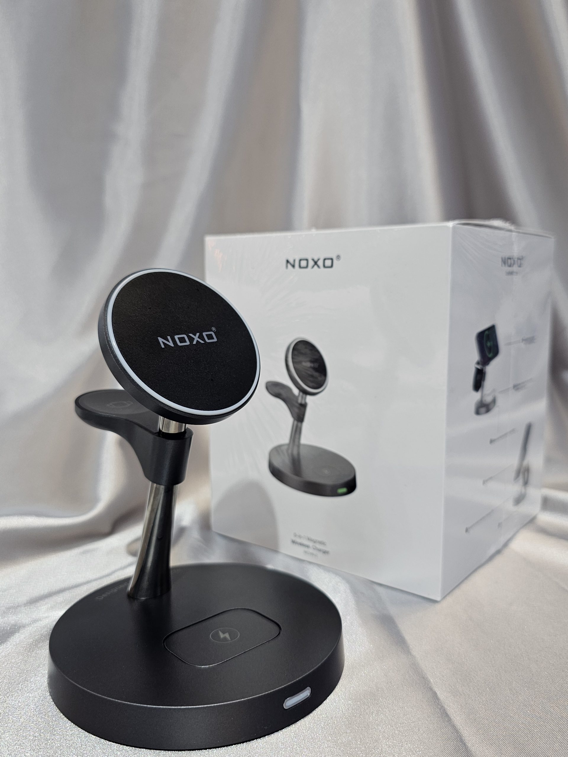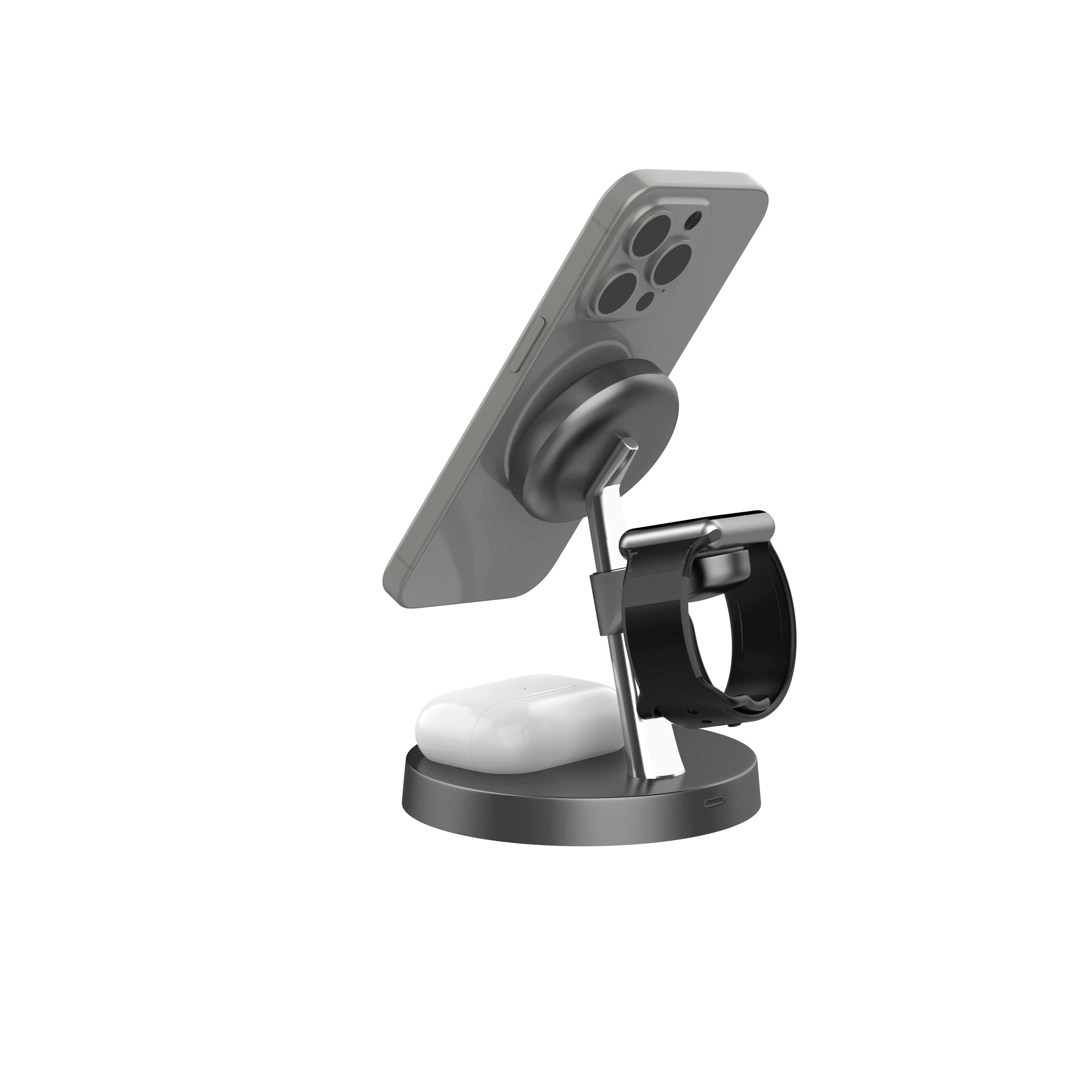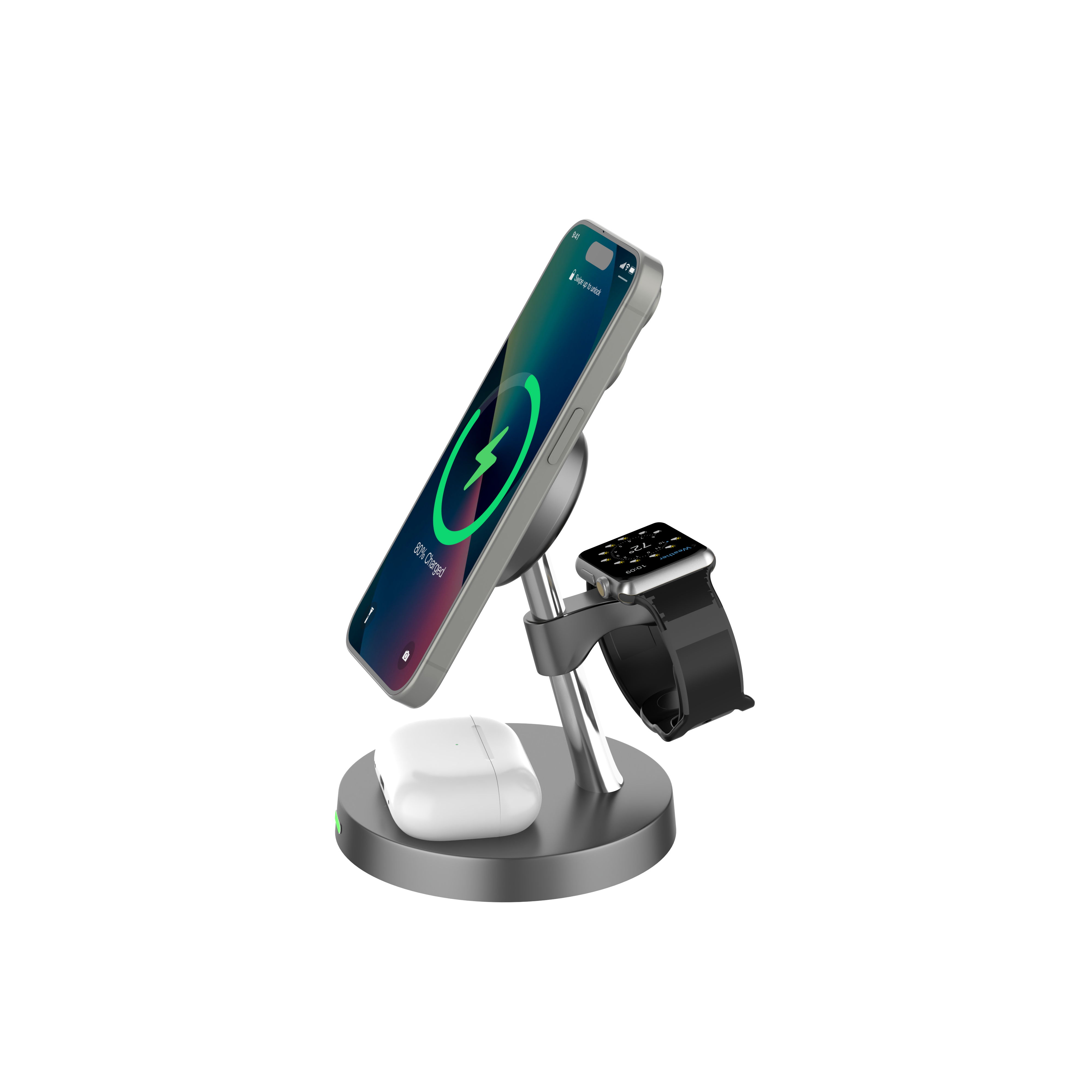 This product is a Qi standard multi-functional magnetic fast wireless charger, which can support simultaneous charging of IP12/13/14/15/16 series as well as smart phones with Qi wireless charging function, Smart Watches and bluetooth earphones. It is equipped with a three-level touch adjustable LED night light. The magnetic part of this product adopts a magnetic coil design, allowing you to place your phone vertically or horizontally without affecting its charging. It is a convenient and practical intelligent electronic device, which is situtable for home and office using.